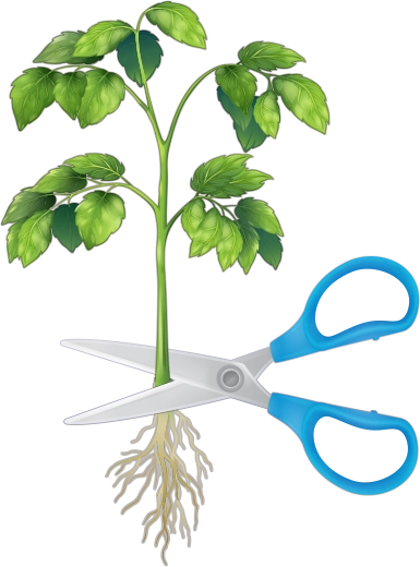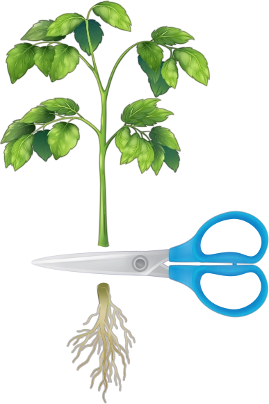 가위로 방울토마토 모종 뿌리를 자르세요.