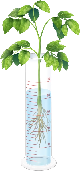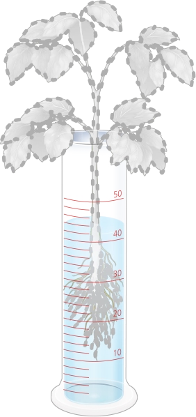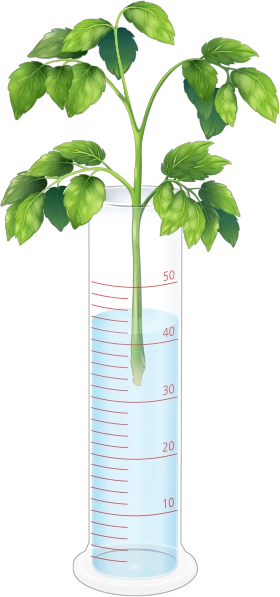 크기와 뿌리가 비슷한 방울토마토 모종 두 개를 준비하여 하나만 뿌리를 자른 뒤, 두 개의 눈금실린더에 물을 같은 높이로 담고 방울토마토 모종을 올려놓습니다.