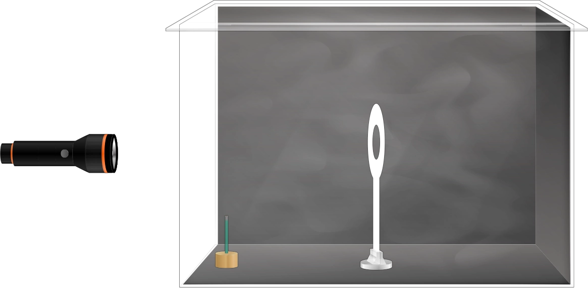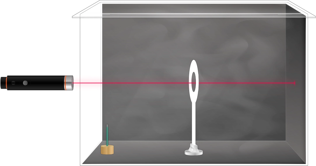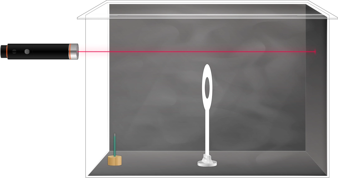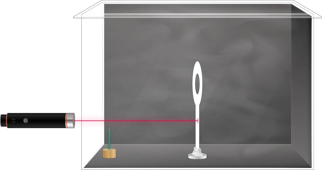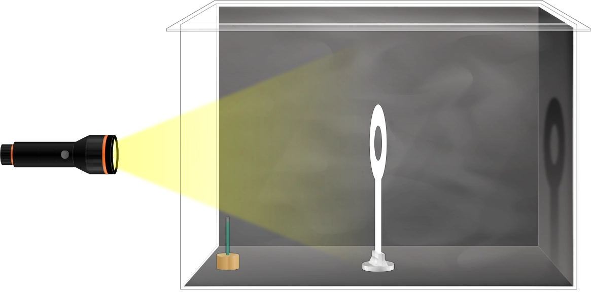 레이저 빛을 고리 모양 종이의 손잡이에 비출 때 빛은 곧게 나아가다가 고리 모양 종이를 통과하지 못합니다.