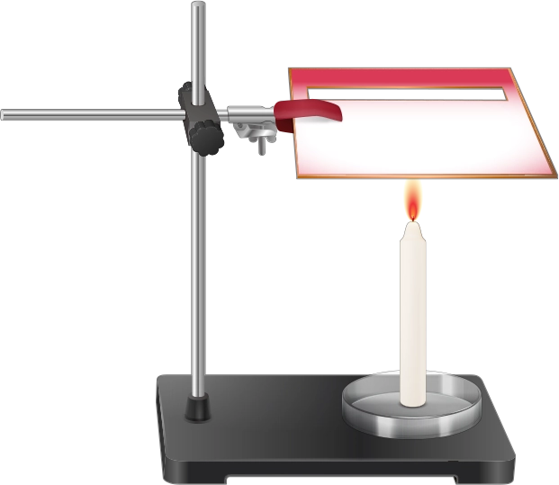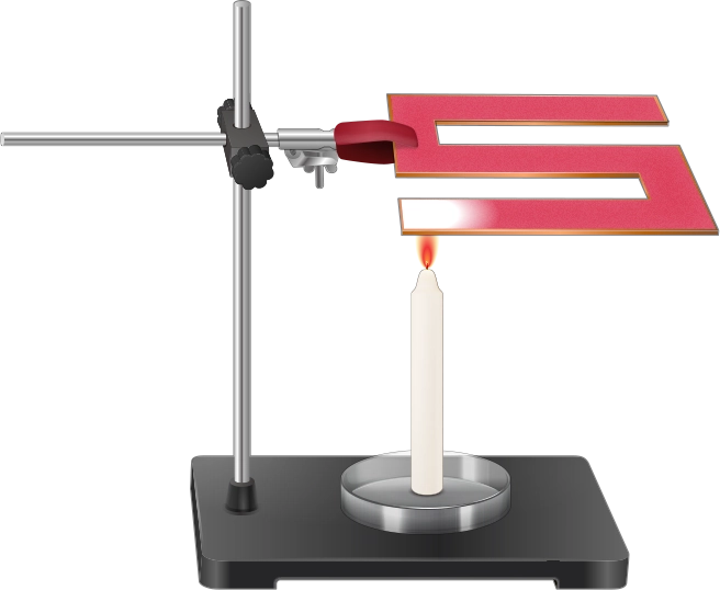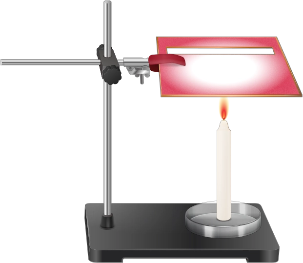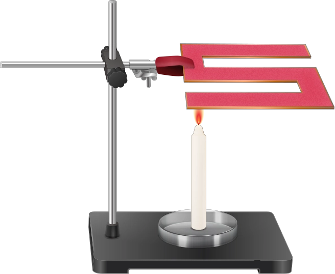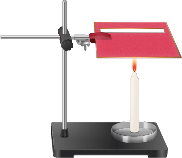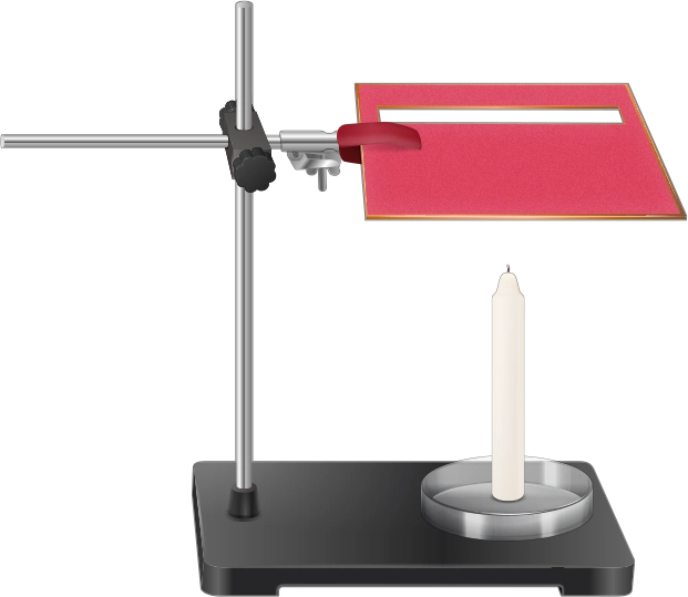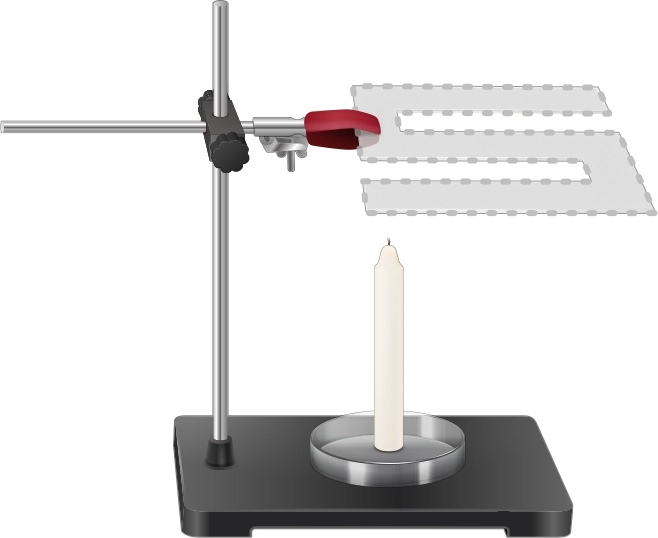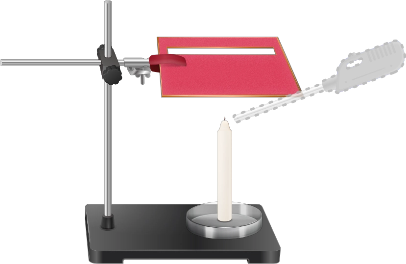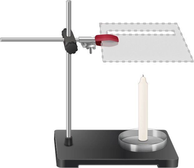 긴 틈이 있는 정사각형 열 변색 스티커를 붙인 구리판의 중앙에 초의 불꽃을 가까이 하고 구리판의 색깔 변화를 관찰해 봅시다.
