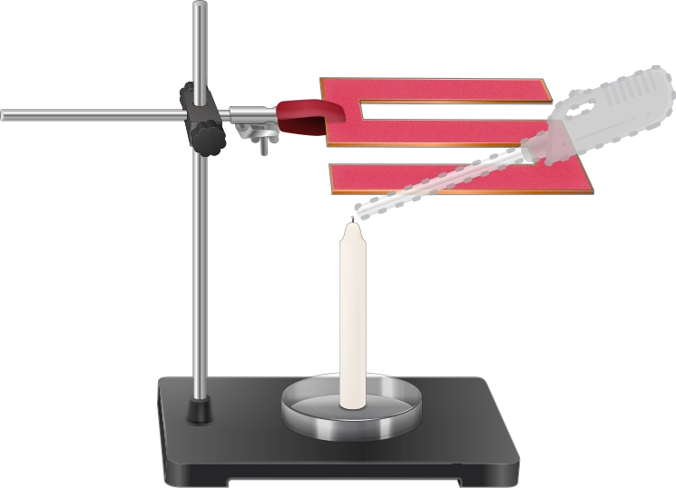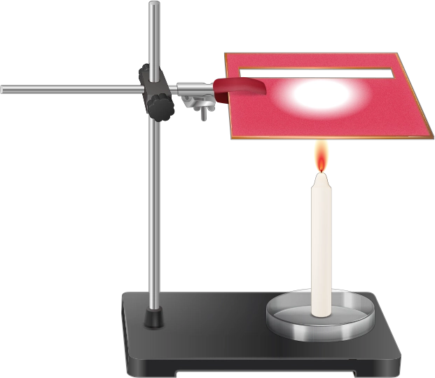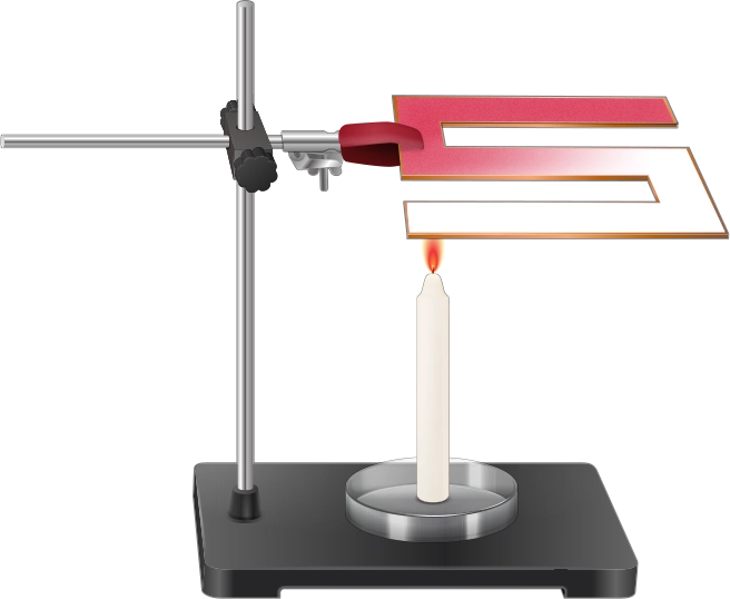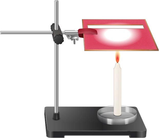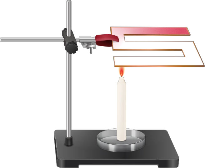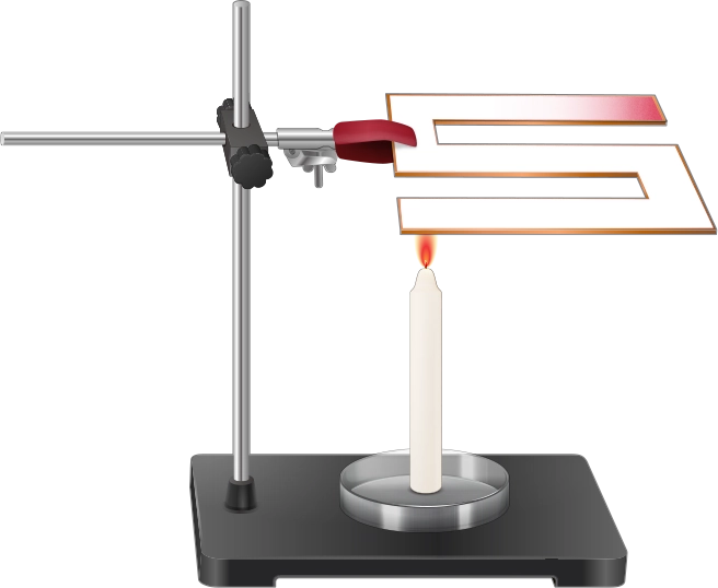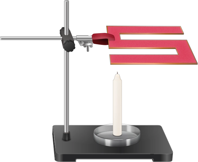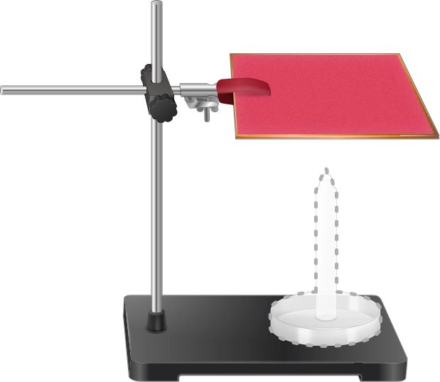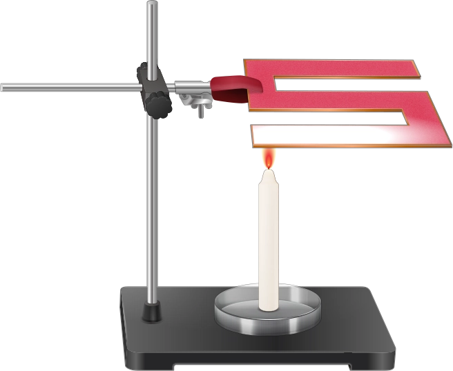 긴 틈이 있는 정사각형 열 변색 스티커를 붙인 구리판의 중앙에 초의 불꽃을 가까이 하고 구리판의 색깔 변화를 관찰해 봅시다.