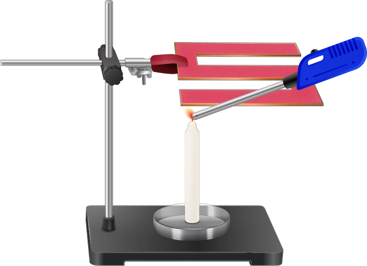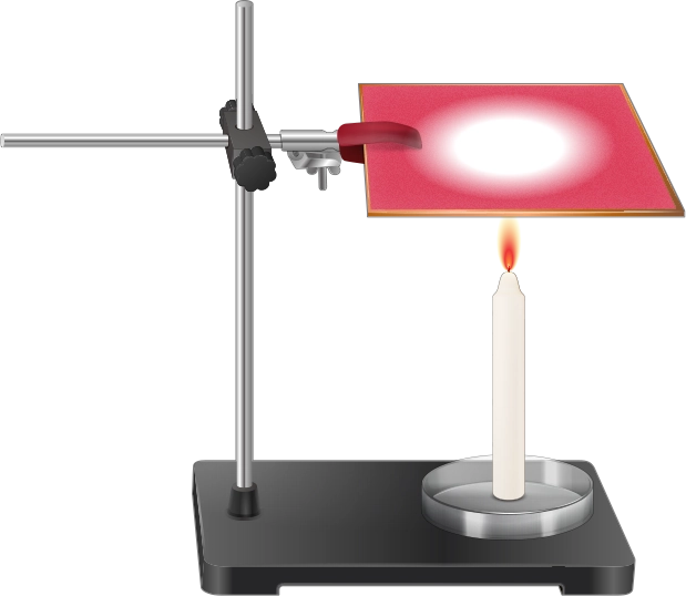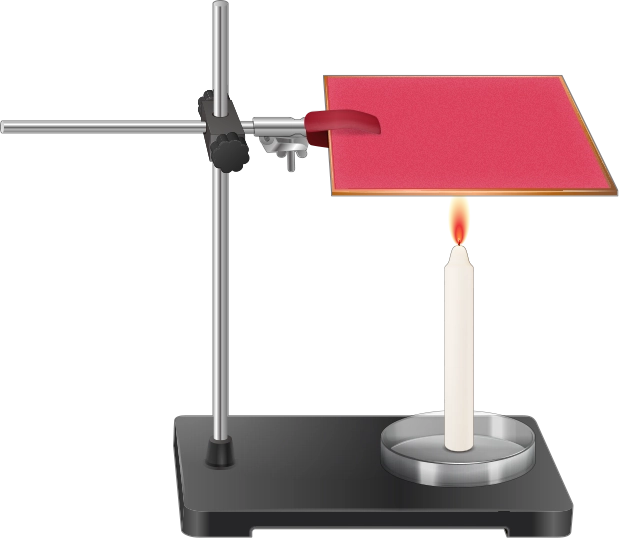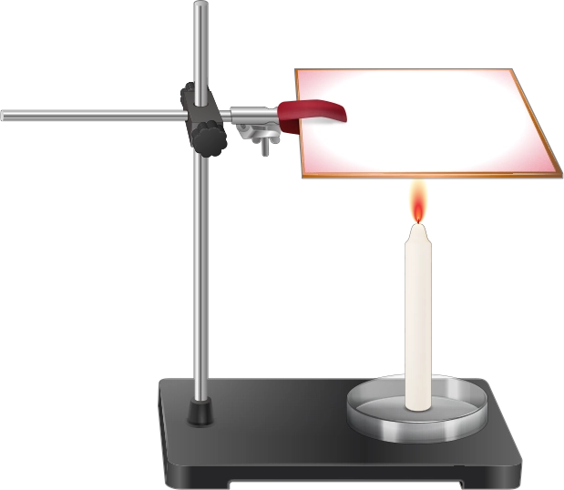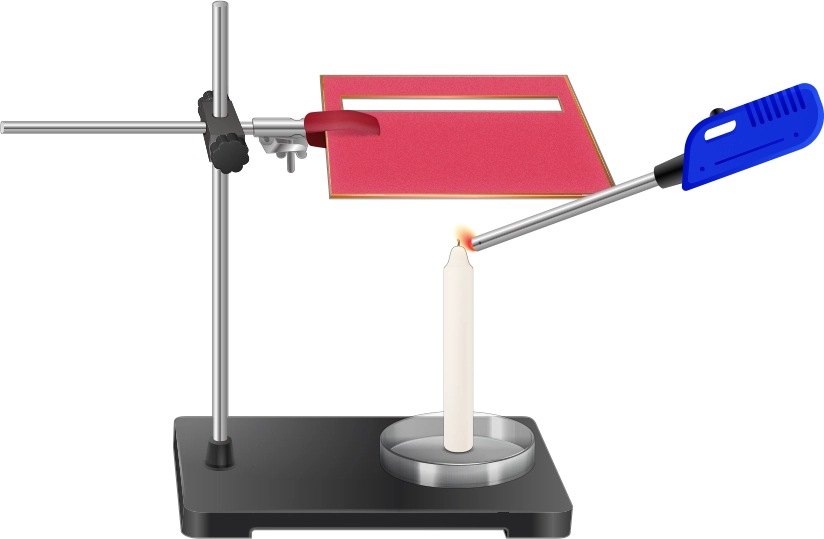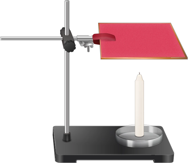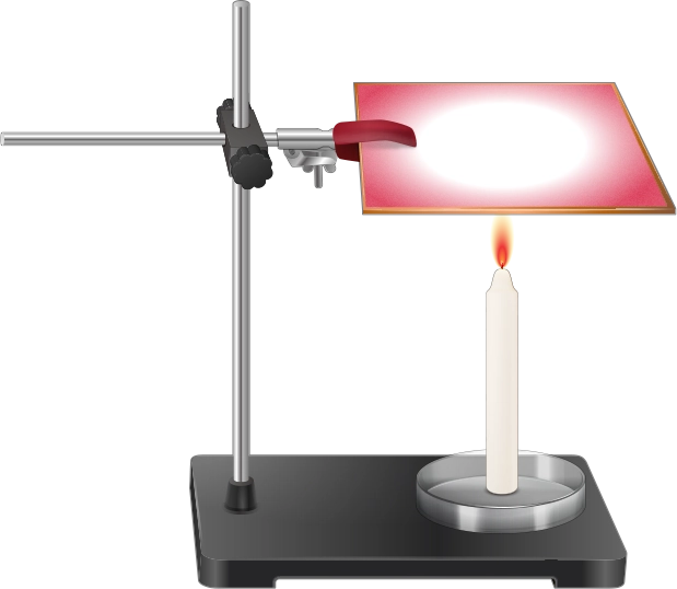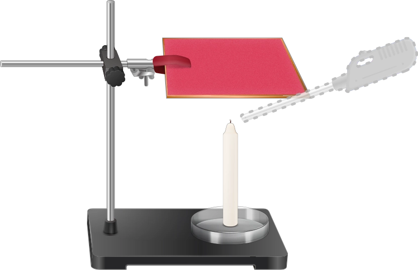 점화기로 초에 불을 켠 다음 정사각형 열 변색 스티커를 붙인 구리판 중앙에 초의 불꽃을 가까이 하고 구리판의 색깔 변화를 관찰해 봅시다.