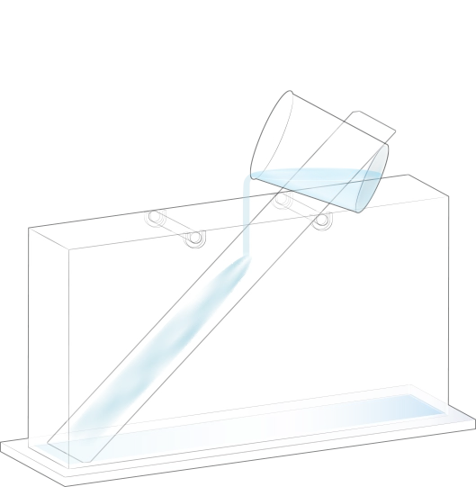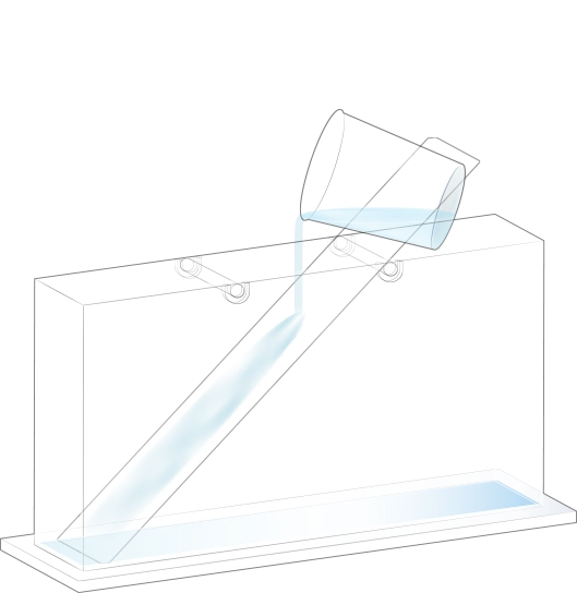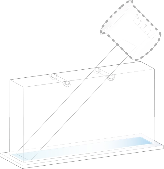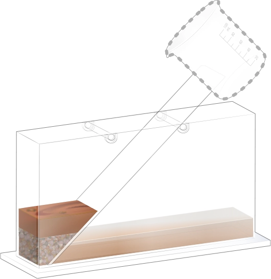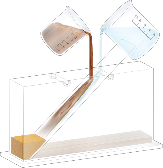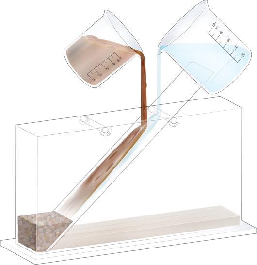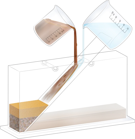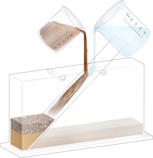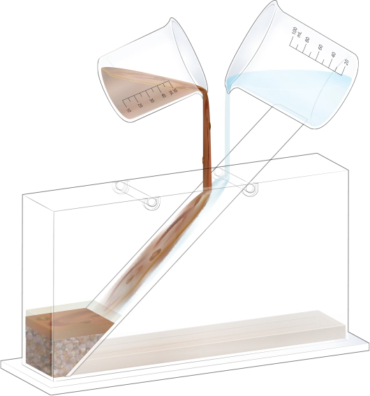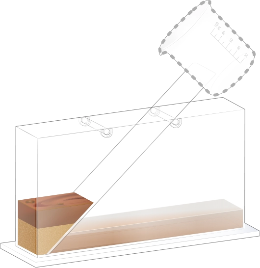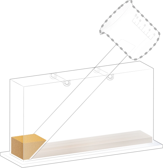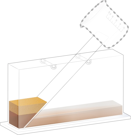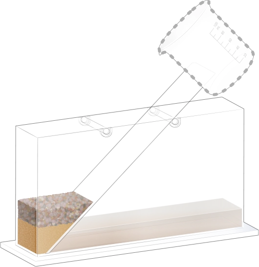 지층 실험용 수조의 오른쪽에 물이 든 플라스틱 비커를 옮겨 넣어 첫 번째 순서 물질과 함께 흘려보내세요.