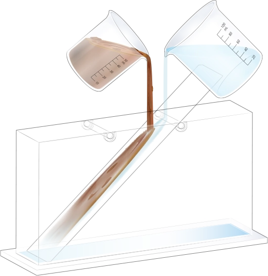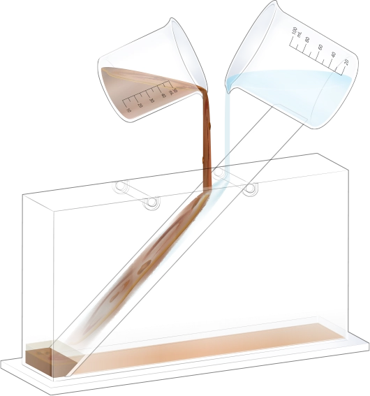 지층 실험용 수조의 오른쪽에 물이 든 플라스틱 비커를 옮겨 넣어 두 번째 순서 물질과 함께 흘려보내세요.