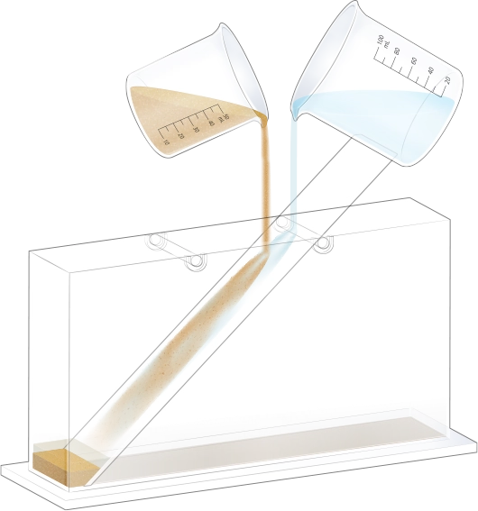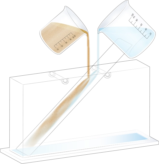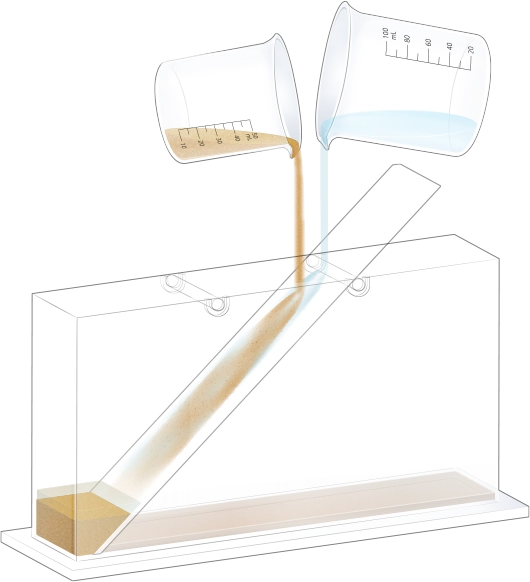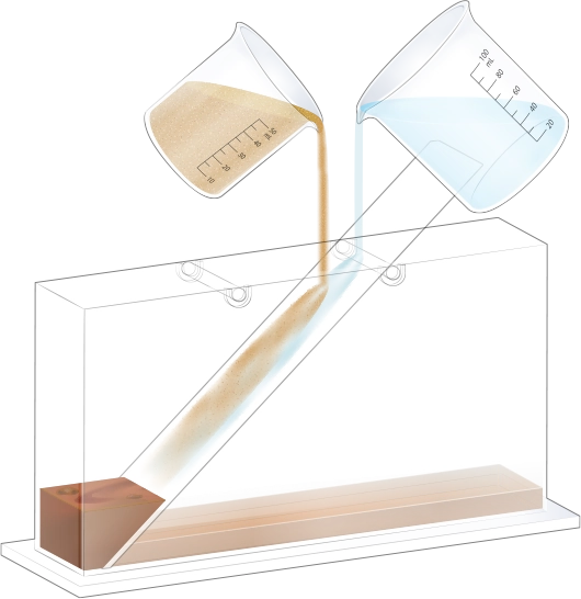 자갈, 모래, 진흙을 흘려보낼 순서를 정한 뒤 물과 함께 경사면을 따라 흘려보내어 지층 모형을 만듭니다.