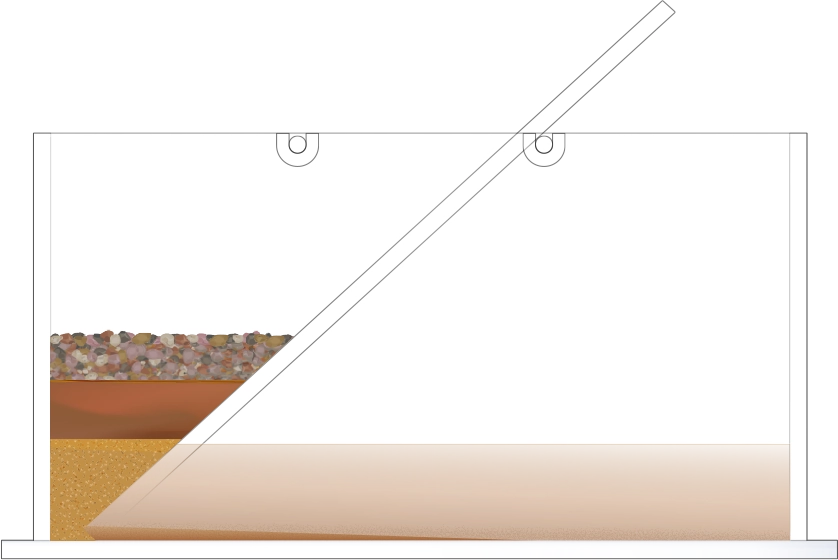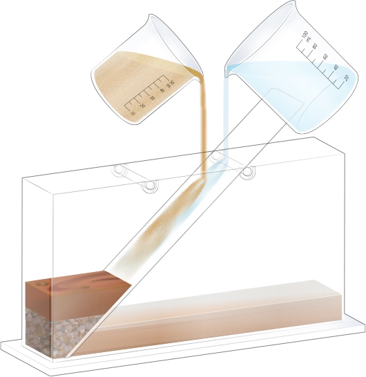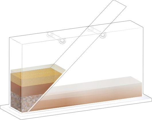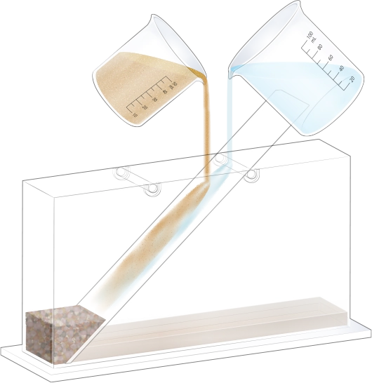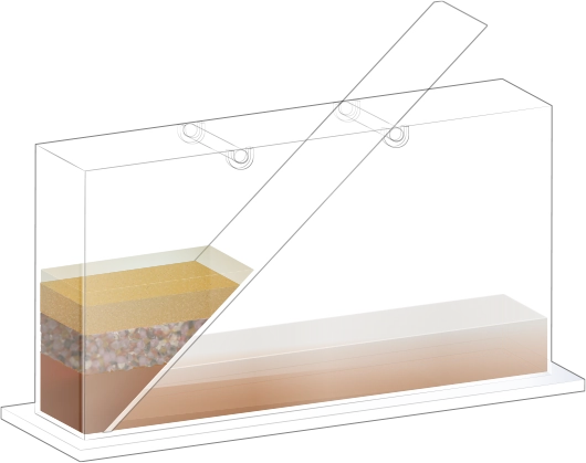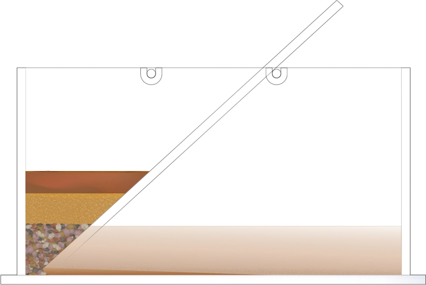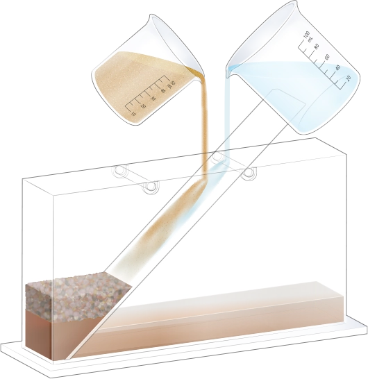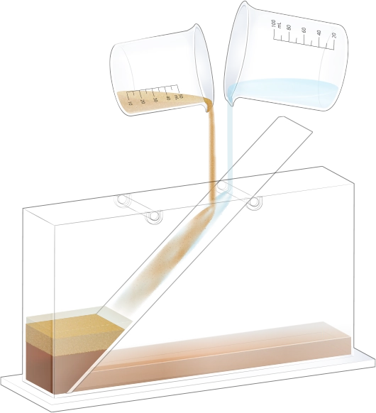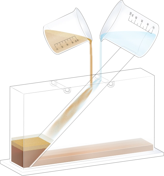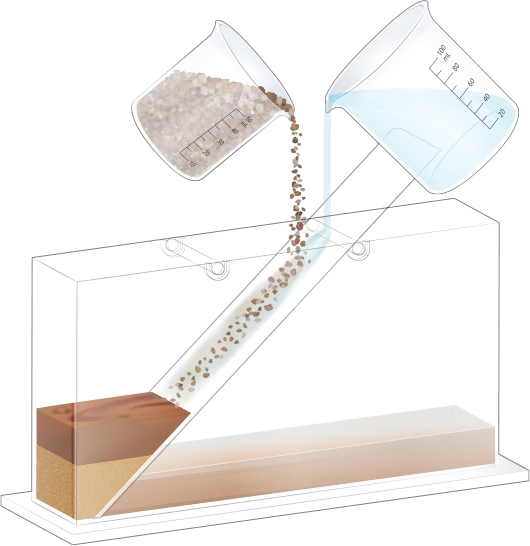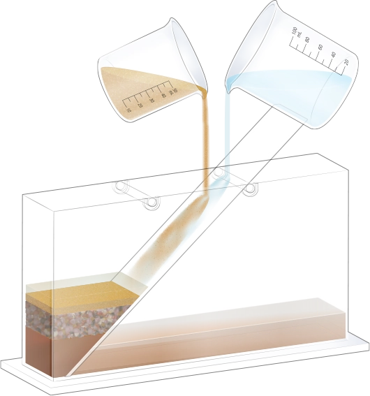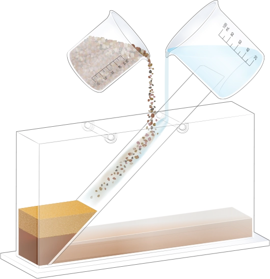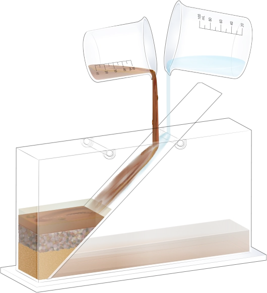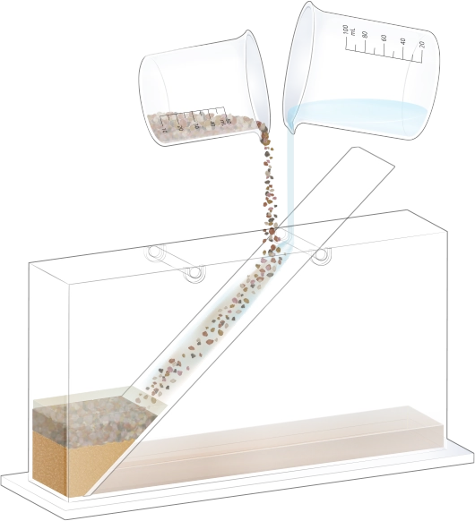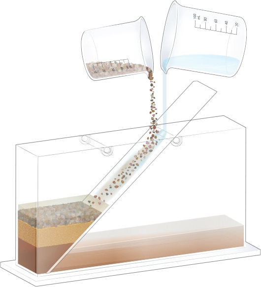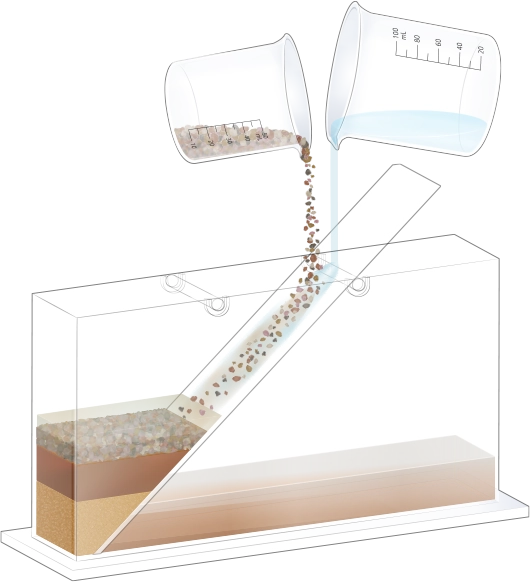 수조의 바닥이 잠길 만큼 물을 넣고, 자갈, 모래, 진흙을 흘려보낼 순서를 정한 뒤 물과 함께 경사면을 따라 흘려보내어 지층 모형을 만듭니다.