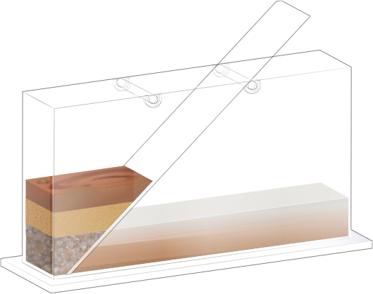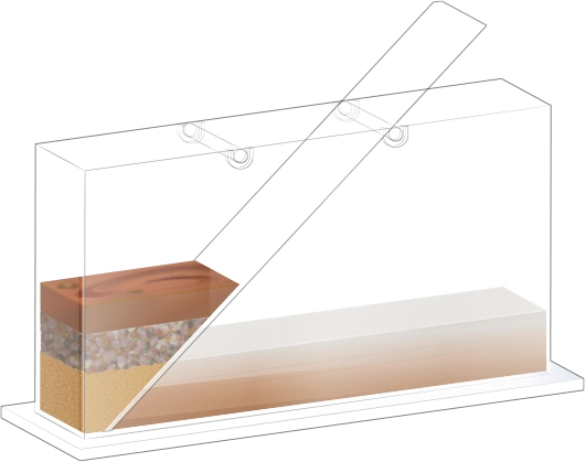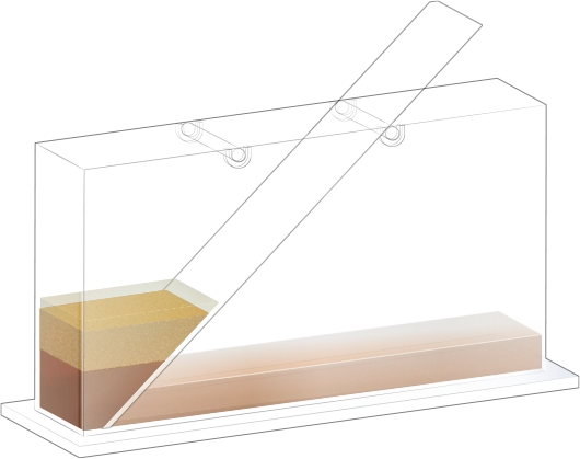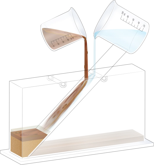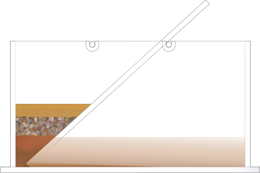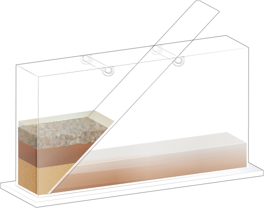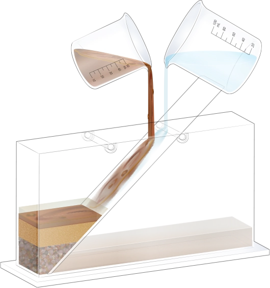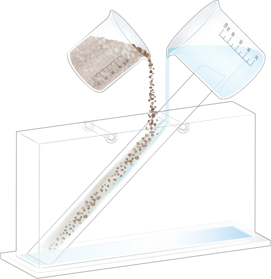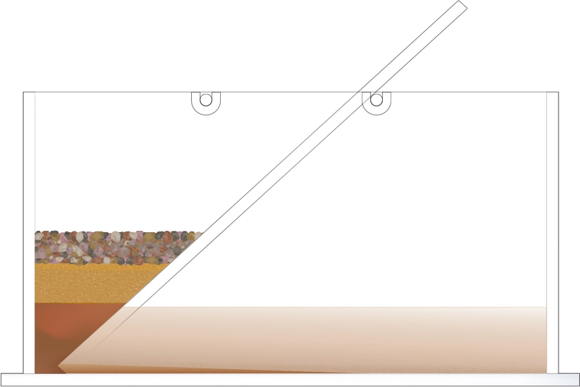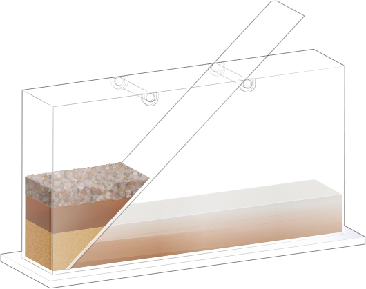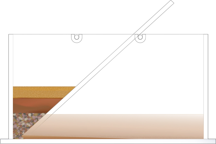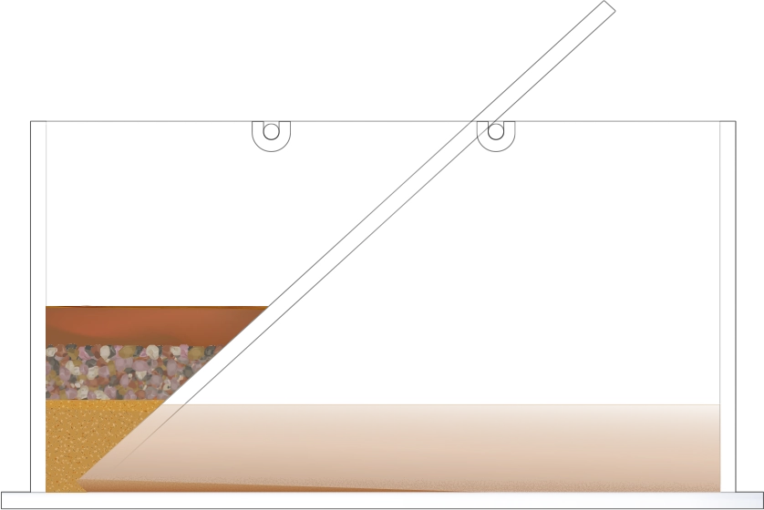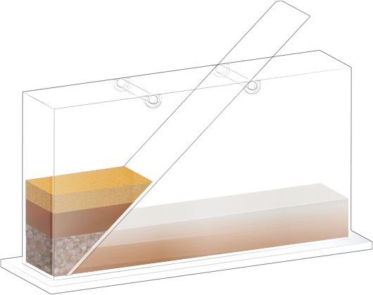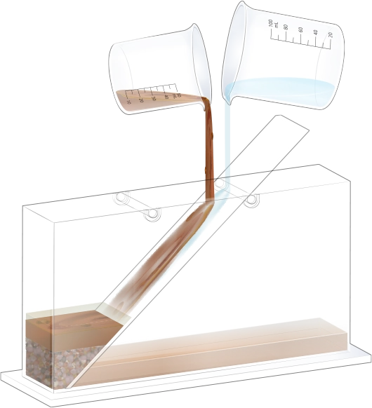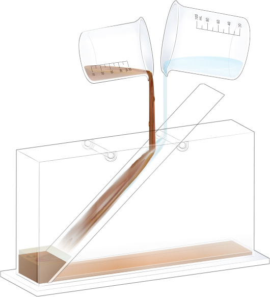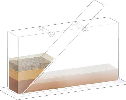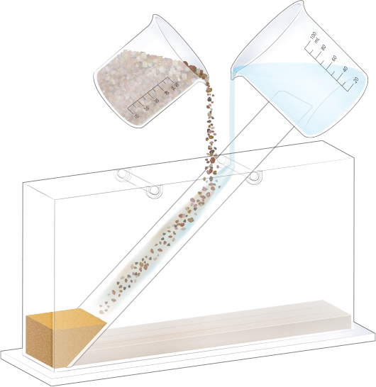 수조의 바닥이 잠길 만큼 물을 넣고, 자갈, 모래, 진흙을 흘려보낼 순서를 정한 뒤 물과 함께 경사면을 따라 흘려보내어 지층 모형을 만듭니다.