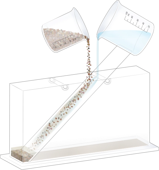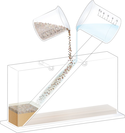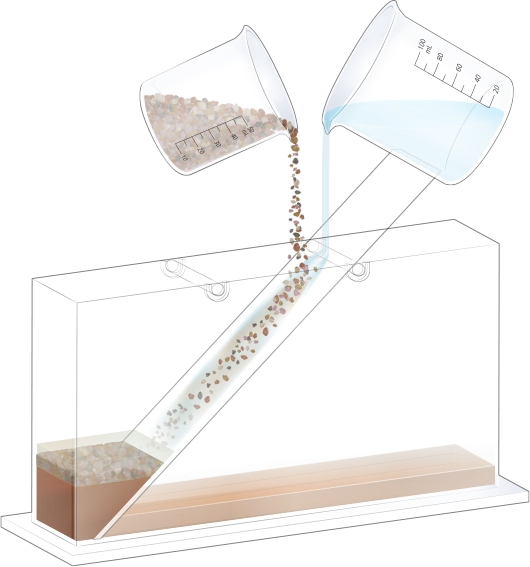 흐르는 물이 자갈, 모래, 진흙 등을 운반하여 수조 아래쪽에 퇴적물을 쌓습니다.